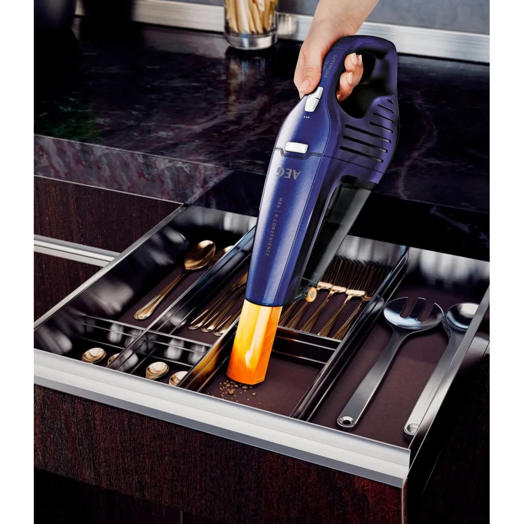 2 Leistungsstufen, Ladestation zur Wandmontage und freistehend in 5 Positionen fixierbar, Zubehör: Herausziehbare Fugendüse und Möbel-Bürste (in der Ladestation), 2-Positionen-Handgriff, Doppelfilterung mit Filterschnellreinigungsfunktion, Ladestoppfunktion, Farbe: Deep Blue Metallic