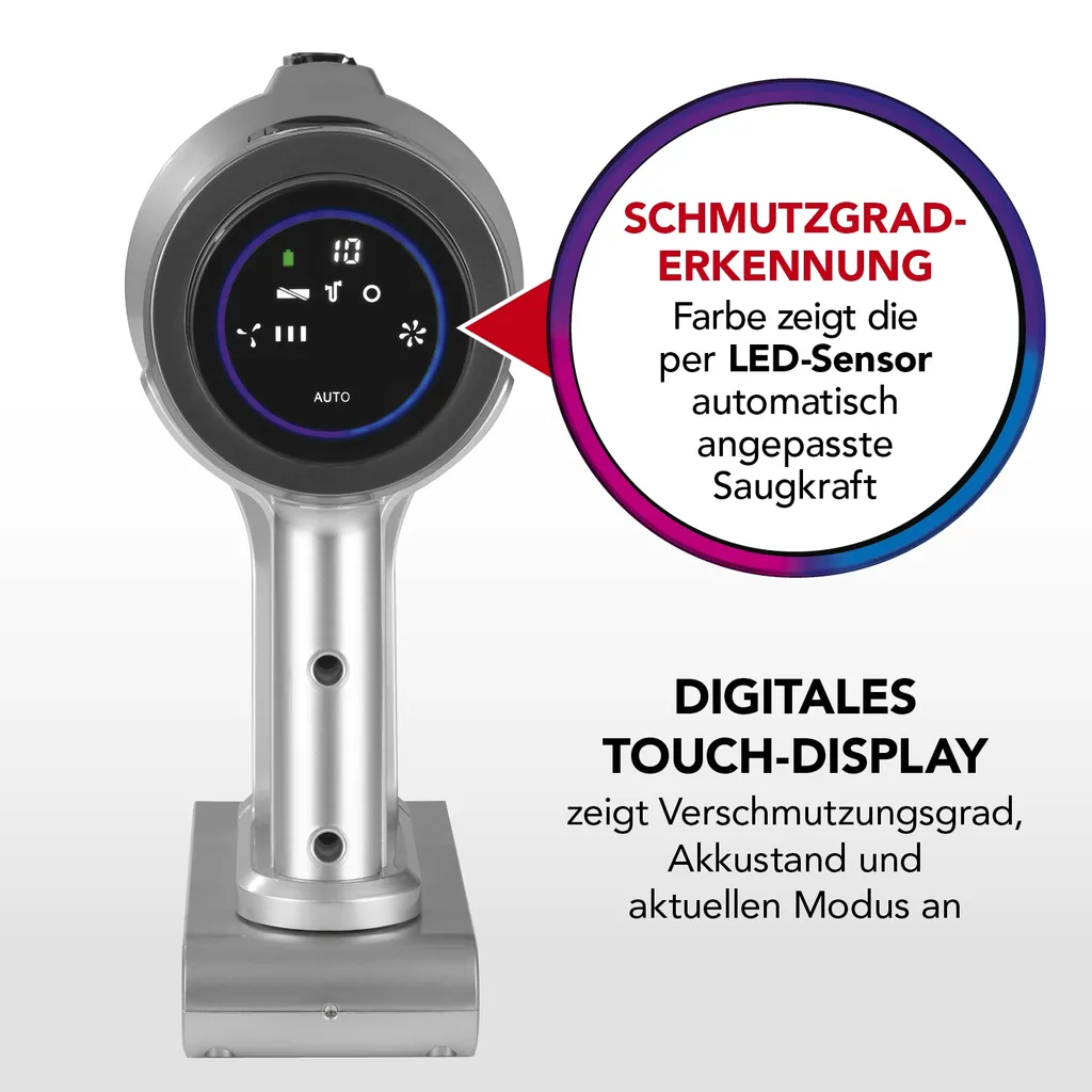 Der besondere Clou aber ist seine intelligente Sonderausstattung: Er erkennt beim Reinigen automatisch den Grad der Verschmutzung und passt die Saugleistung dementsprechend an – von moderat bis turbostark. Das moderne digitale Touch-Display zeigt den Verschmutzungsgrad, den Akkustand und den Modus an. Dank der aufsetzbaren LED-Fugendüse kannst du präzise bis in die kleinste Ecke putzen. So befreist du Tastaturen, Möbel, Autositze, Teppichböden, Treppenstufen u.v.m. von Staub, Schmutz und sogar Tierhaaren – immer mit der optimalen Saugstärke!