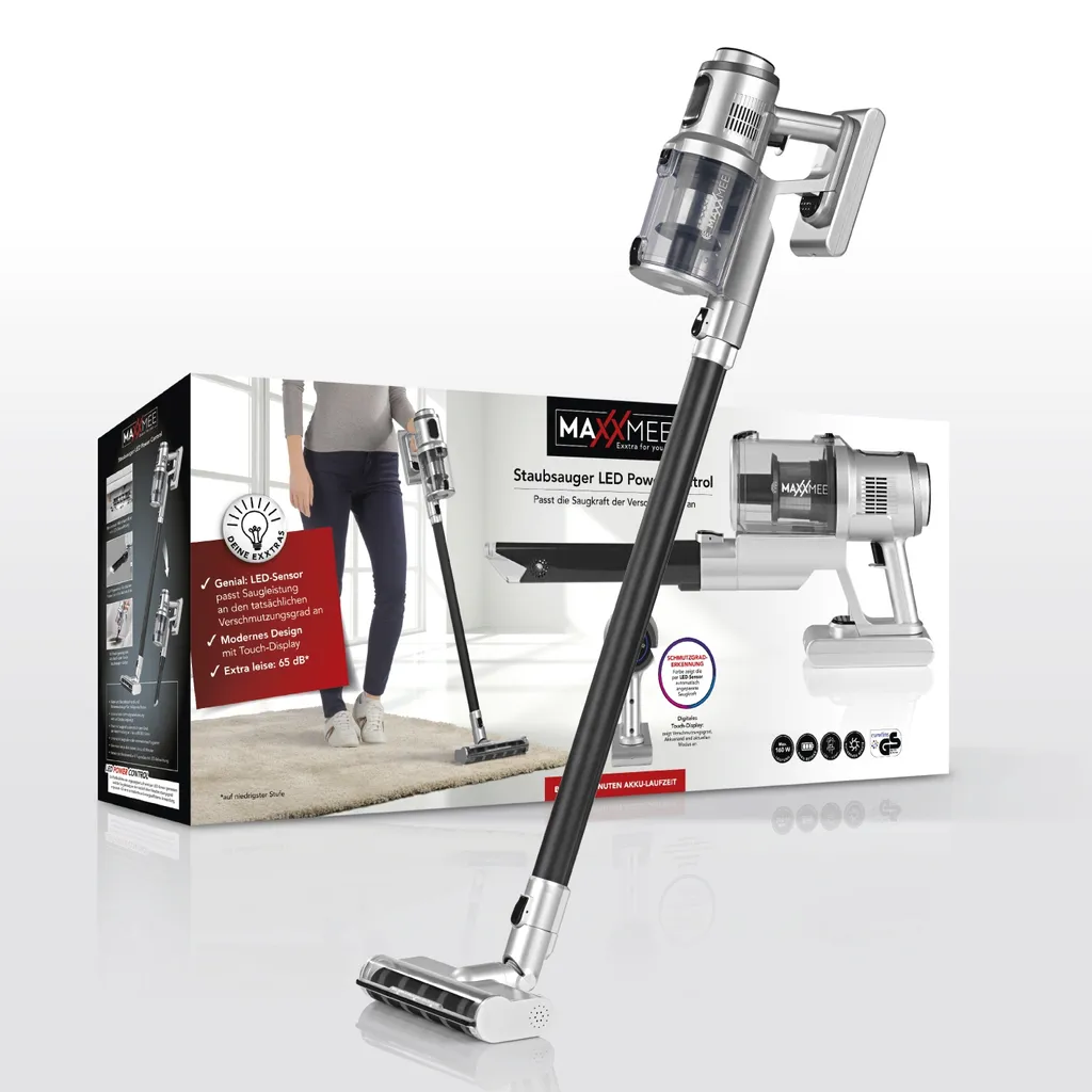 Putzen mit dem schlauen Extra: Der kabel- und beutellose Staubsauger LED Power Control von MAXXMEE vereint Hand- und Bodenstaubsauger in einem kompakten, flexiblen Gerät. Durch das stabile Verlängerungsrohr aus Metall wird er im Handumdrehen zum Bodenstaubsauger, ohne bleibt er ein kompakter, kabelloser Handstaubsauger.