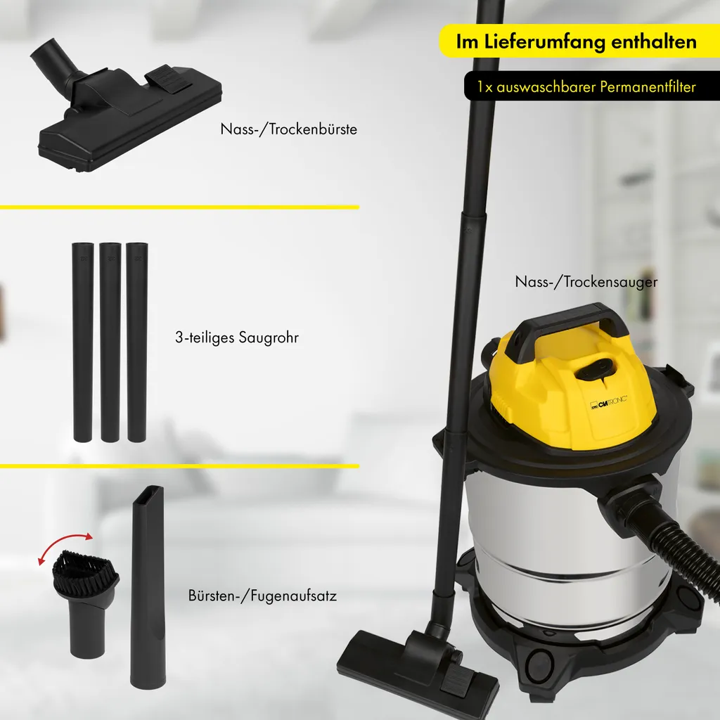 - Im Lieferumfang enthalten ist der Nass Trocken Staubsauger, ein Bürsten-/Fugenaufsatz, eine Nass-/Trockenbürste, das 3-teilige Saugrohr und ein auswaschbarer Permanentfilter für den Nass Trocken Sauger