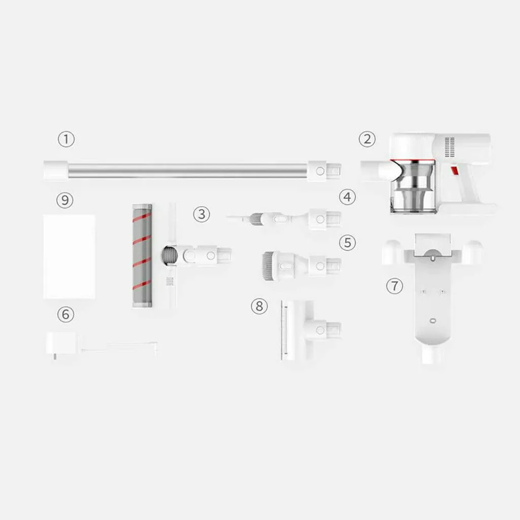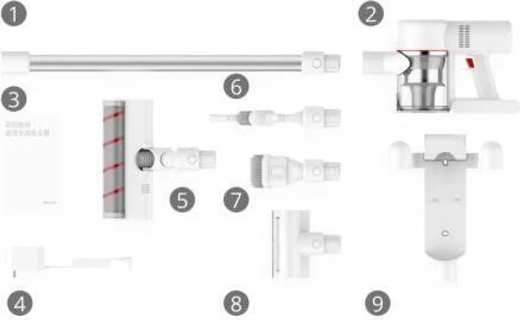- Packungsinhalt: 1 x Staubsauger, 1 x Verbindungsstab, 1 x Reinigungskopf für weiche Walzen, 1 x 2 in 1 Fugendüse, 1 x 2 in 1 Staubbürste, 1 x Ladegerät, 1 x Wandladestation, 1 x Reinigungskopf für elektrische Milben, 1 x englisches Handbuch