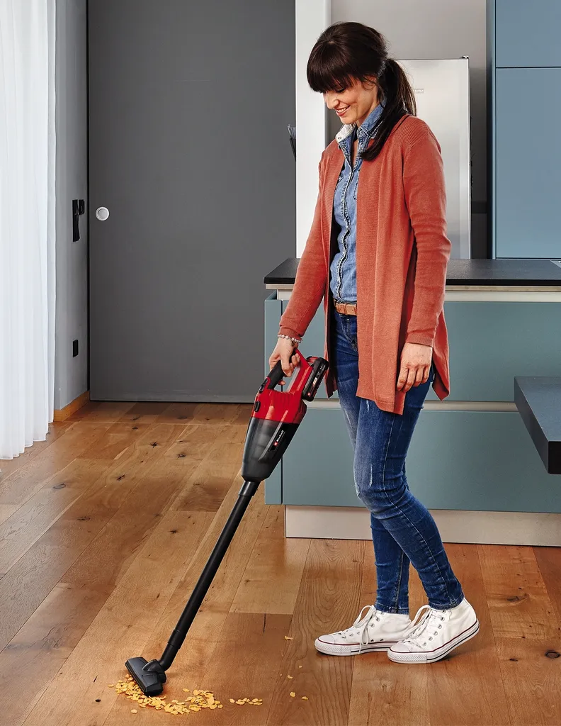 Der Einhell Akku-Handstaubsauger TE-VC 18 Li-Solo ist jederzeit griffbereit, um Schmutz und lästige Krümel zu beseitigen, ob auf Teppich, Sofa oder Tisch. Das handliche Kraftpaket gehört der bewährten Power X-Change Familie von Einhell an. Akkus dieser Reihe können in allen Geräten der Systemfamilie verwendet werden. Kurze Reichweiten, zahllose Akkus und Ladegeräte sowie schwache Leistungen gehören der Vergangenheit an. Der Akku-Handstaubsauger reinigt blitzschnell jede Oberfläche dank seiner drei Düsen, die im Lieferumfang enthalten sind. Die Bodendüse ist speziell für Hartböden und glatte Flächen geeignet. Eine weitere Düse ist für Polster und Stoffe geeignet. Mit der Fugendüse reinigt der Benutzer auch schwer erreichbare Stellen ohne große Mühen. Mit Hilfe des 46,5 Zentimeter langen Verlängerungsrohrs kann der handliche Akku-Staubsauger auch als Bodenstaubsauger und damit bequem in einer aufrechten Haltung eingesetzt werden. Der Staubfangbehälter verfügt über ein Fassungsvermögen von 540 Milliliter. Die Lieferung erfolgt ohne Akku und Ladegerät, diese sind separat erhältlich, zum Beispiel als praktisches Starterset.