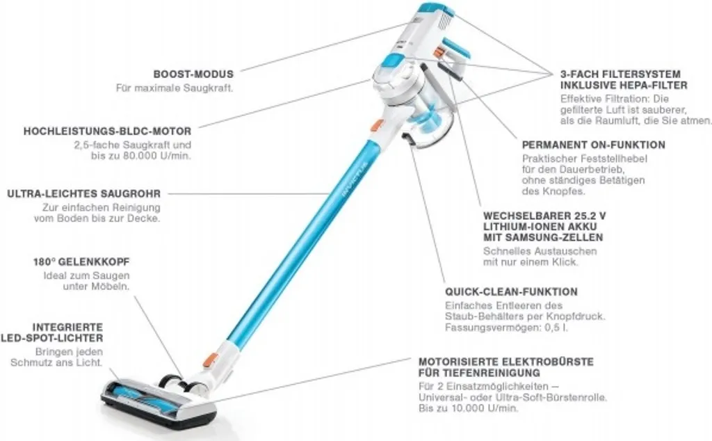 - Hochleistungs-BLDC-Motor: Dieser verfügt über einen Hochleistungs-BLDC Motor mit 2,5-facher Saugkraft, bis zu 80.000 Umdrehungen/Minute und einer maximalen Leistung von 360 Watt.
