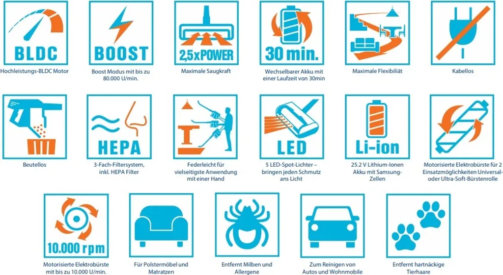- Starker Lithium-Ionen Akku: Enthalten ist ein wechselbarer 25,2 V Lithium-Ionen Akku mit Samsung-Zellen mit einer Akkulaufzeit von max. 30 min und 8 min im Boost-Modus. Nach nur 3-4 Stunden Ladezeit ist das Gerät wieder voll einsatzbereit.