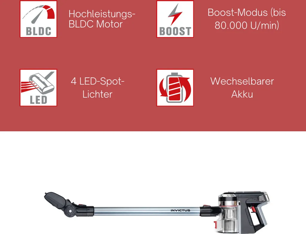 Der moderne, elegante und innovative INVICTUS X9 zeichnet sich durch führende Technik, absolute Power und revolutionäres Zubehör aus. Mit dem INVICTUS X9 erhalten Sie ein Kraftpaket mit einem BLDC-Motor der neuesten Generation und einem stärkeren Lithium-Ionen Akku für volle Saugleistung bei kürzerer Ladedauer. Durch das Zusammenspiel von Zubehör und Power erreichen Sie bis zu 15% mehr Reinigungsleistung.