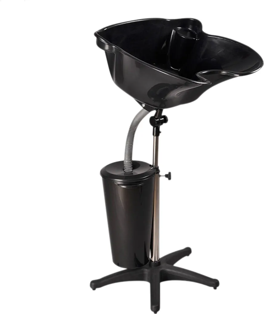 Die Tiefspülmaschine besteht aus hochwertigem Kunststoff, der sich leicht von Farb- und Haarresten entfernen lässt. Darüber hinaus verfügt die Schüssel der Waschmaschine über eine bequeme Neigungswinkeleinstellung mit einer Schraube und ein Ablaufloch mit einem Schlauch zum Ablassen des Wassers direkt in den auf einem verstellbaren Ständer platzierten Tank.