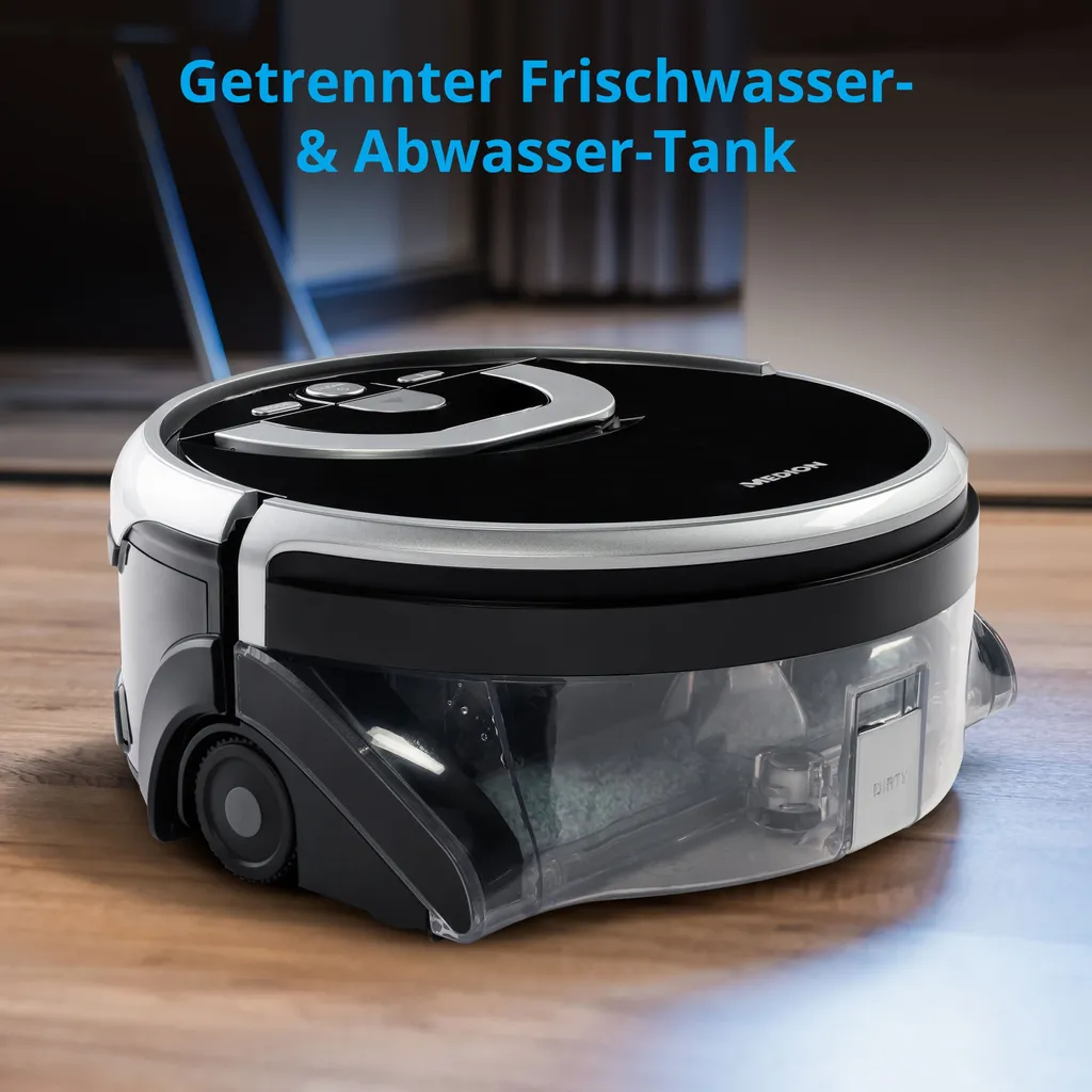 Erfüllen Sie sich den Traum von einem Zuhause, das ohne Ihr Zutun sauber und frisch bleibt. Dieser Haushaltsroboter von MEDION übernimmt das Wischen aller Hartböden im Alleingang – vollautomatisch und mit einer Leistung wie vom Profi. Eine intelligente Navigation sorgt während des Putzvorgangs dafür, dass der Wischroboter systematische Linien fährt und Haare, Schmutz sowie Staub mit seiner starken Reinigungswalze zuverlässig entfernt. Sie müssen dafür lediglich den Wassertank füllen und den Roboter dann zum Beispiel starten, wenn Sie ohnehin außer Haus gehen. Die getrennten Tanks für Frisch- und Abwasser sorgen während der Reinigung für glänzende Ergebnisse. Das ist eine wirklich saubere Lösung für Ihr Zuhause!