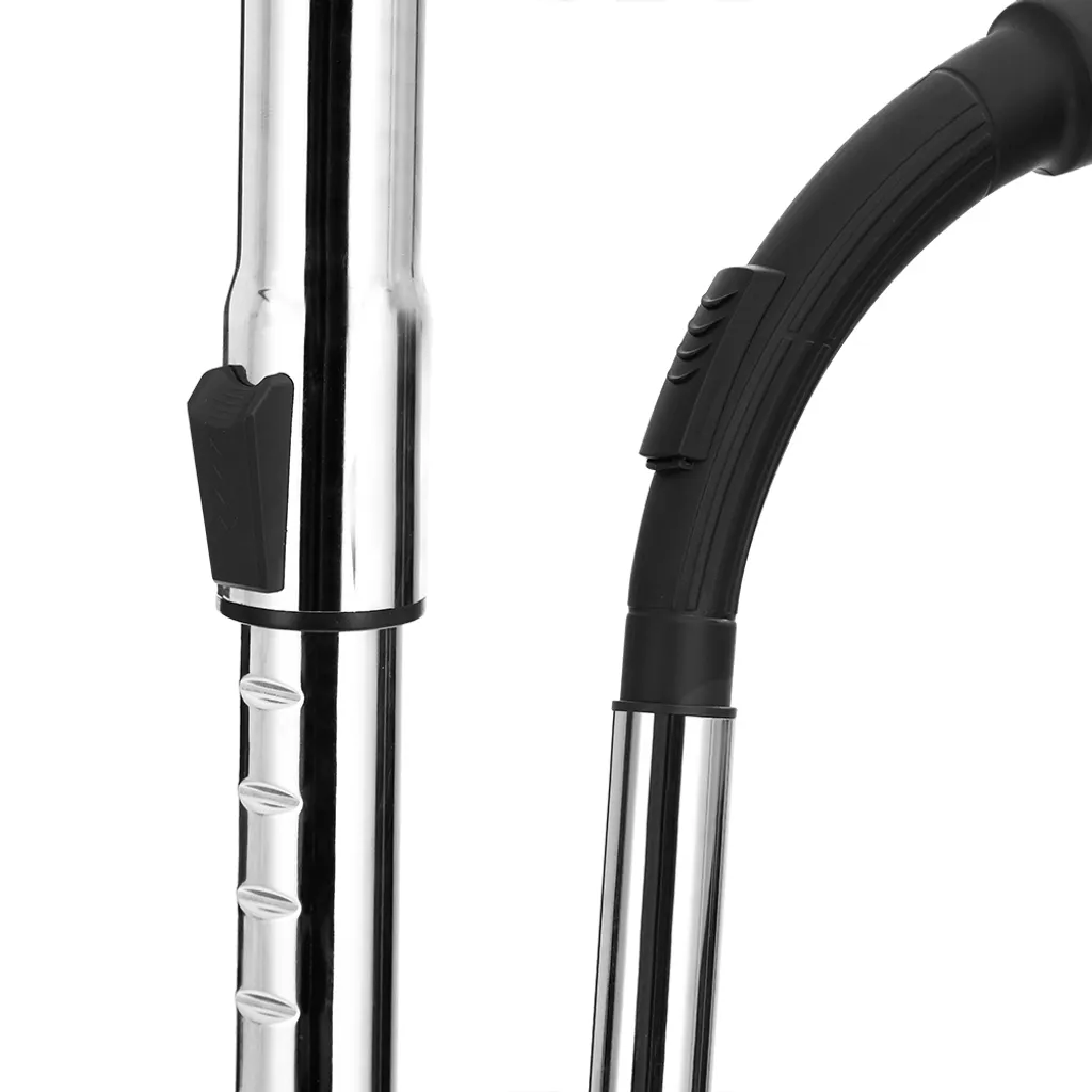 Der Sauger hat außerdem ein verchromtes Metall-Teleskopsaugrohr von 90cm mit Saugkraftregulierung am Griff.