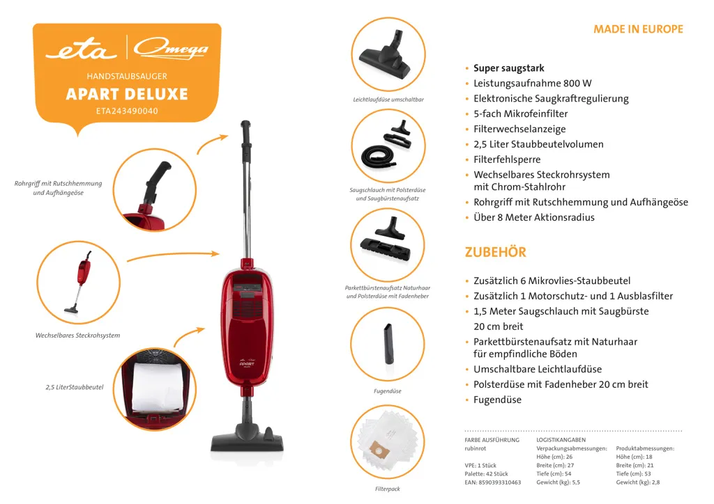 800 Watt, mit Beutel, Leichtaufdüse umschaltbar, Parkettbürstenaufsatz Naturhaar, Polsterdüse mit Fadenheber, Fugendüse, Rohrgriff mit Rutschhemmung und Aufhängeöse, Saugschlauch mit Polsterdüse und Saugbürstenaufsatz Wechselbares Steckrohsystem, 2,5 Liter Staubbeutel 1,5m Saugschlauch mit Möbelbürste über 8 Meter Aktionsradius Wechselbares Steckrohrsystem mit Chrom-Stahlrohr Zusätzlich mit 1 Filterpak ETA155853400200 inklusive.