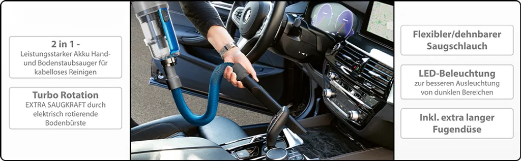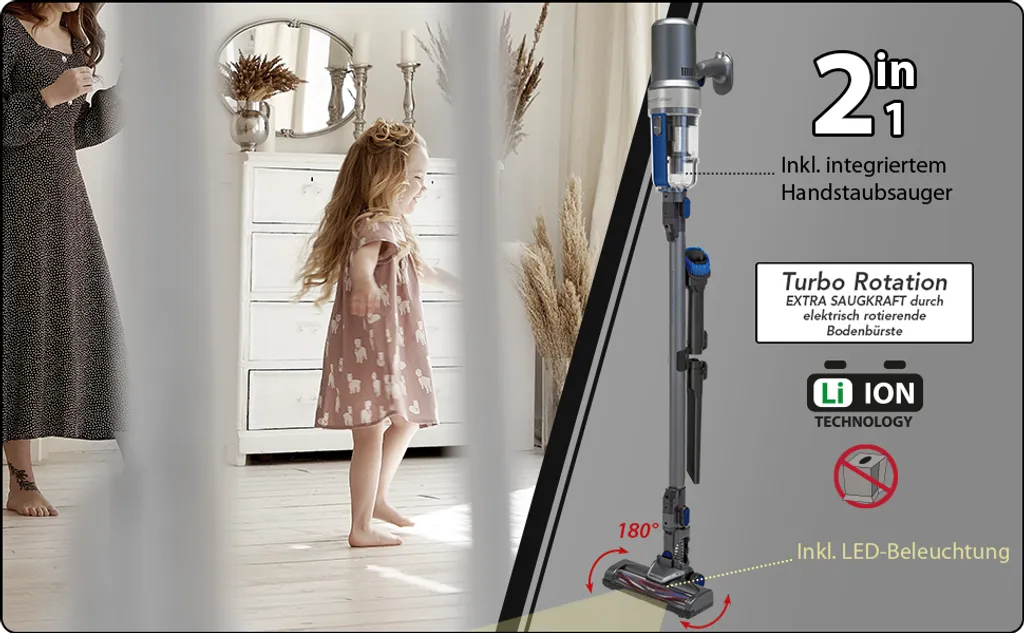 Inklusive — Im Lieferumfang enthalten: elektrisch rotierende Bodenbürste inkl. LED-Beleuchtung, Fugendüse (25 cm), 2in1 Polster-/Bürstendüse, flexibler/dehnbarer Saugschlauch, Wandhalterung.