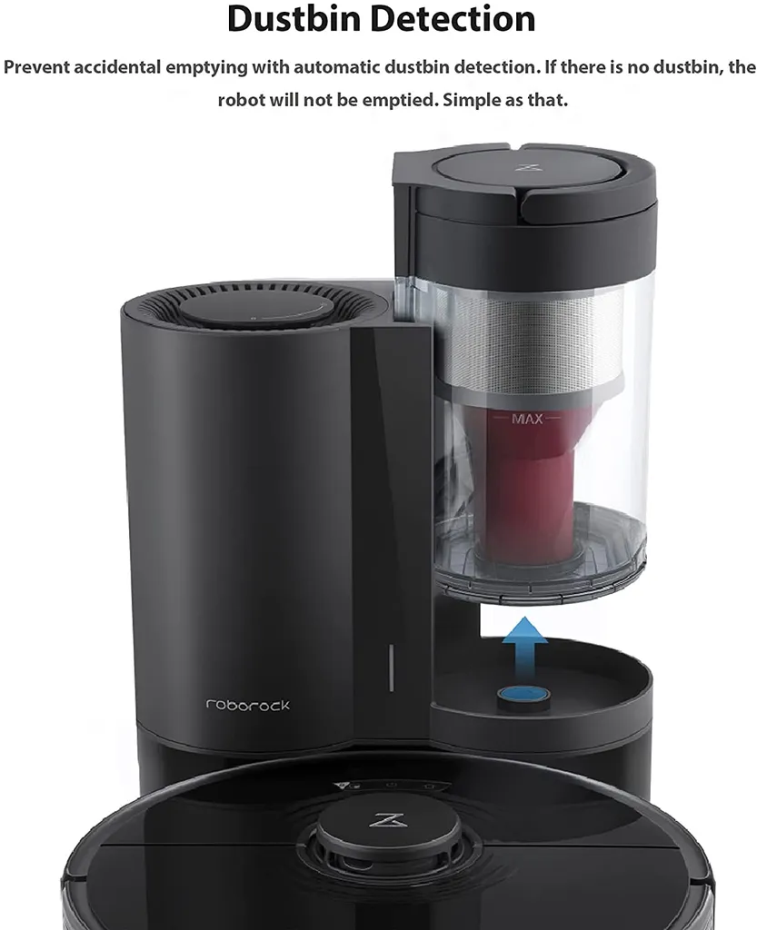 Mülleimer-Erkennung : Die automatische Mülltonnenerkennung verhindert ein versehentliches Entleeren, wenn der Roboter andockt, wenn kein Mülleimer angebracht ist.
