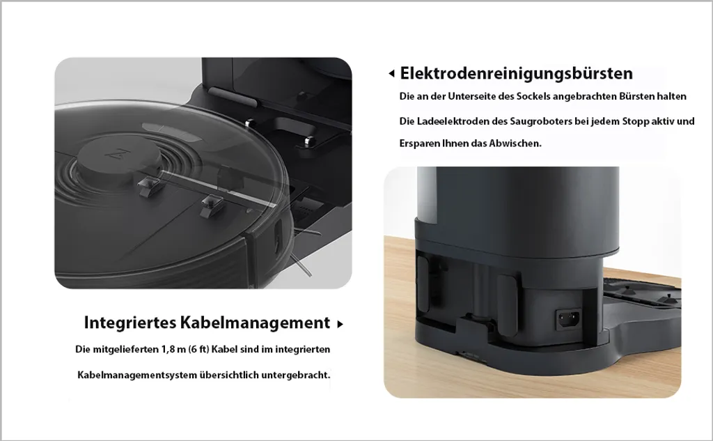 Elektrodenreinigungsbürsten : An der Unterseite des Docks angebrachte Bürsten reinigen die Ladeelektroden des Roboters jedes Mal, wenn er andockt.Zwei Filtrationsoptionen stehen zur Verfügung, um Ihnen ein unterschiedliches Reinigungserlebnis zu bieten.