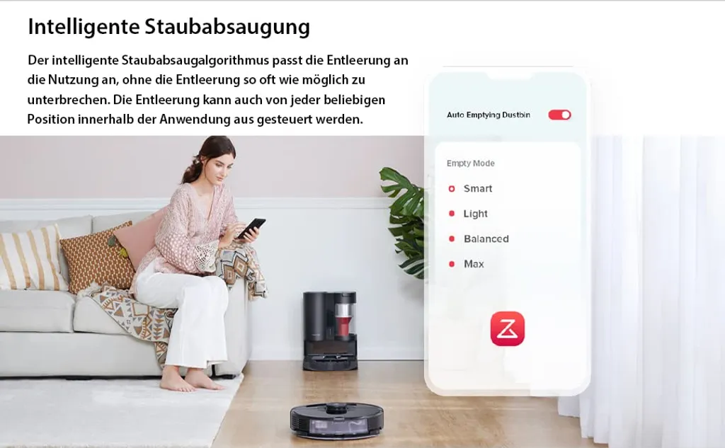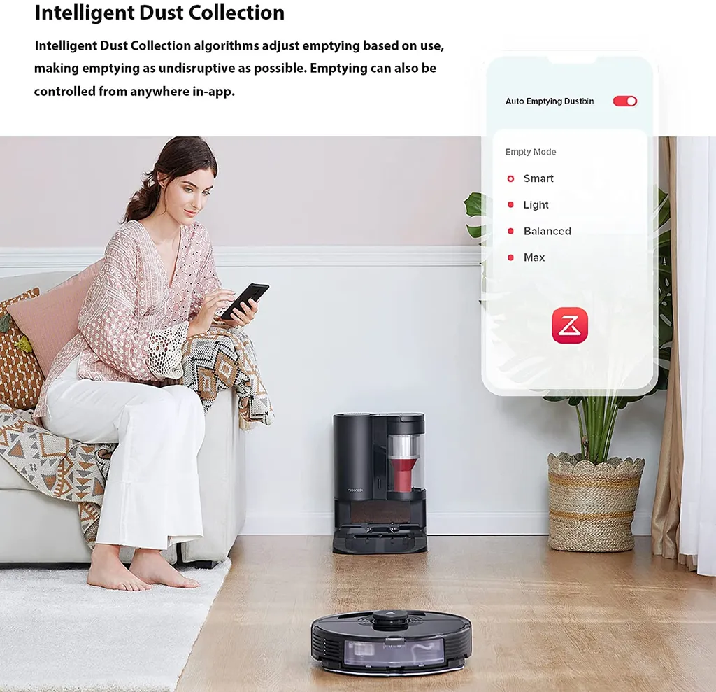 Intelligenter Entleerungsmodus: Wählen Sie aus Smart, Light, Balanced und Max die Entleerungsoption, die Ihren Bedürfnissen entspricht. Im Smart Mode passt der intelligente Staubsammelalgorithmus die Entleerung je nach Nutzung an. Applikationskontrolle, steuern Sie die Entleerung des Roborock S7 jederzeit und überall