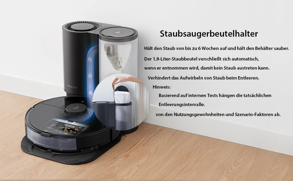 Automatische Staubentleerung: Leert den Roboter-Mülleimer nach einer Reinigung automatisch. Jetzt können Sie Woche für Woche ohne Entleeren reinigen. Ein 15-Zyklon-Design trennt Staub aus dem Luftstrom.