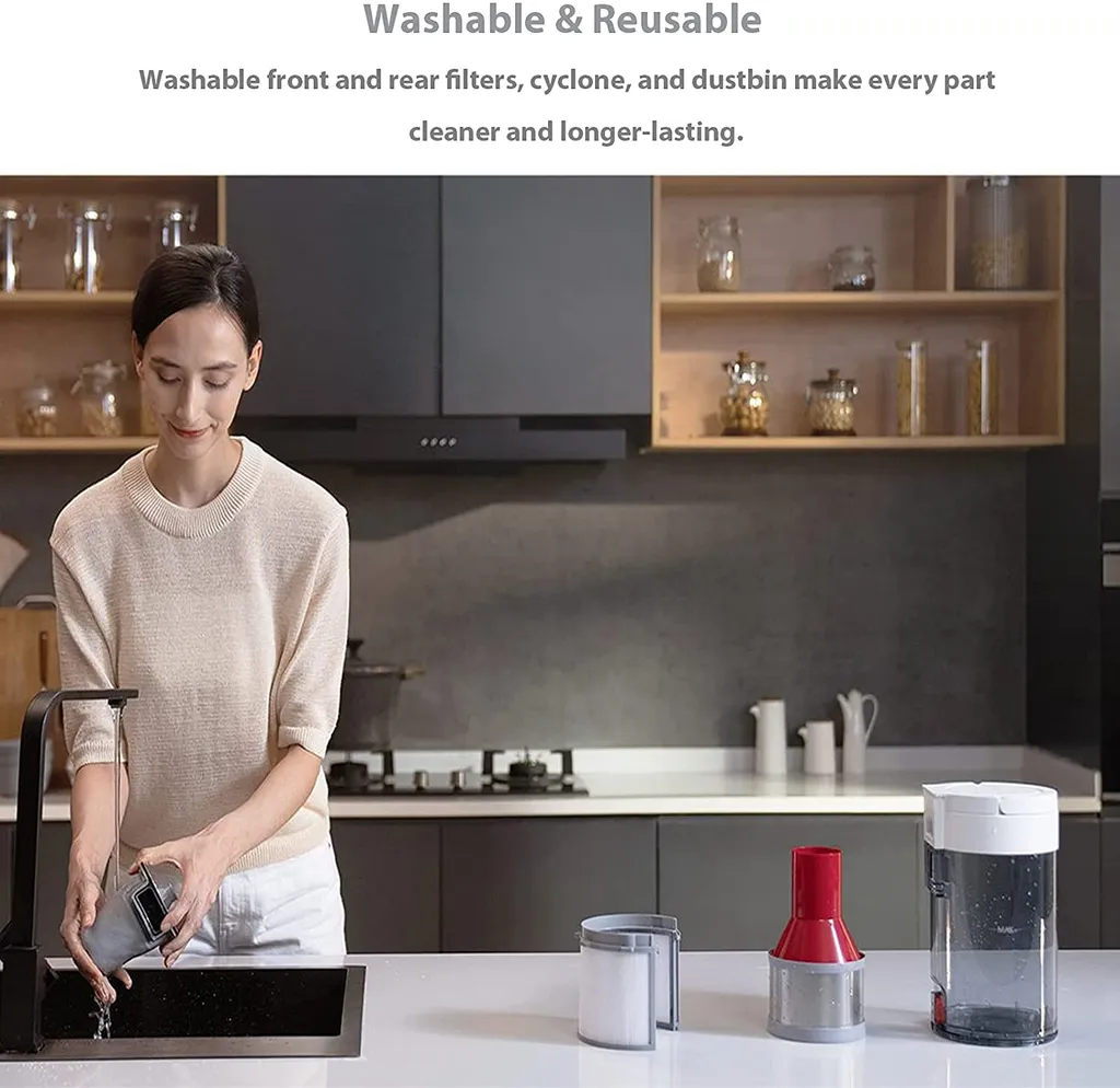 Leicht waschbar : Die vorderen und hinteren Filter sowie der Mülleimer sind abnehmbar und waschbar für eine bessere Hygiene.