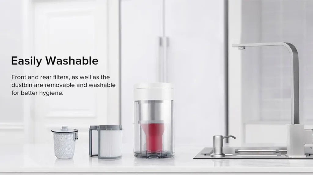 Die vorderen und hinteren Filter sowie der Mülleimer sind abnehmbar und waschbar für eine bessere Hygiene.