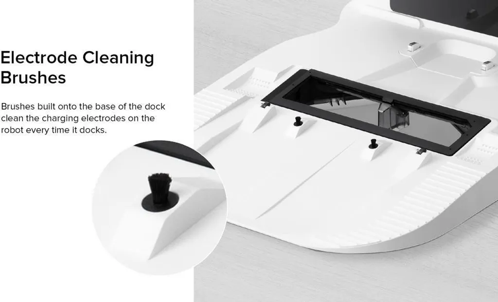 An der Unterseite des Docks angebrachte Bürsten reinigen die Ladeelektroden des Roboters jedes Mal, wenn er andockt.