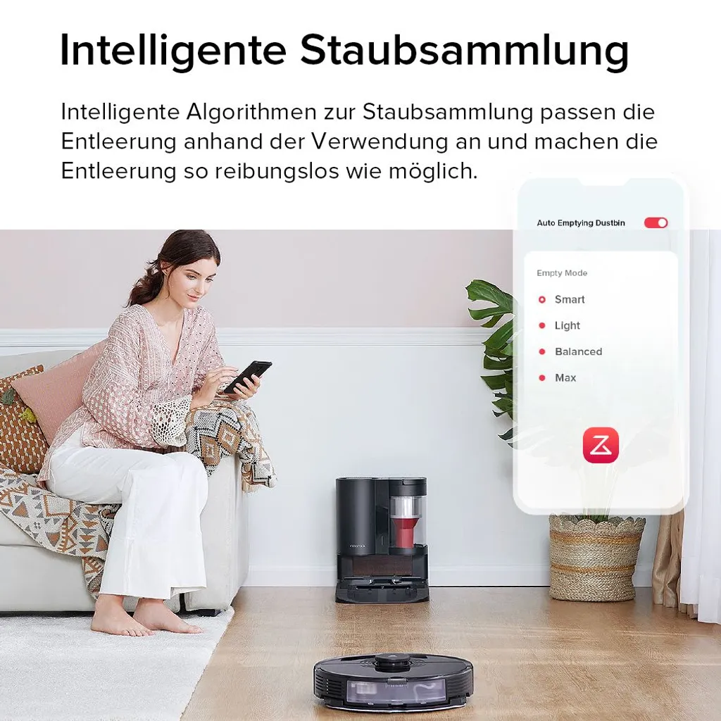 Intelligente Staubsammlung – Intelligente Entstaubungsalgorithmen passen die Entleerung je nach Nutzung an, um die Entleerung so unterbrechungsfrei wie möglich zu gestalten.