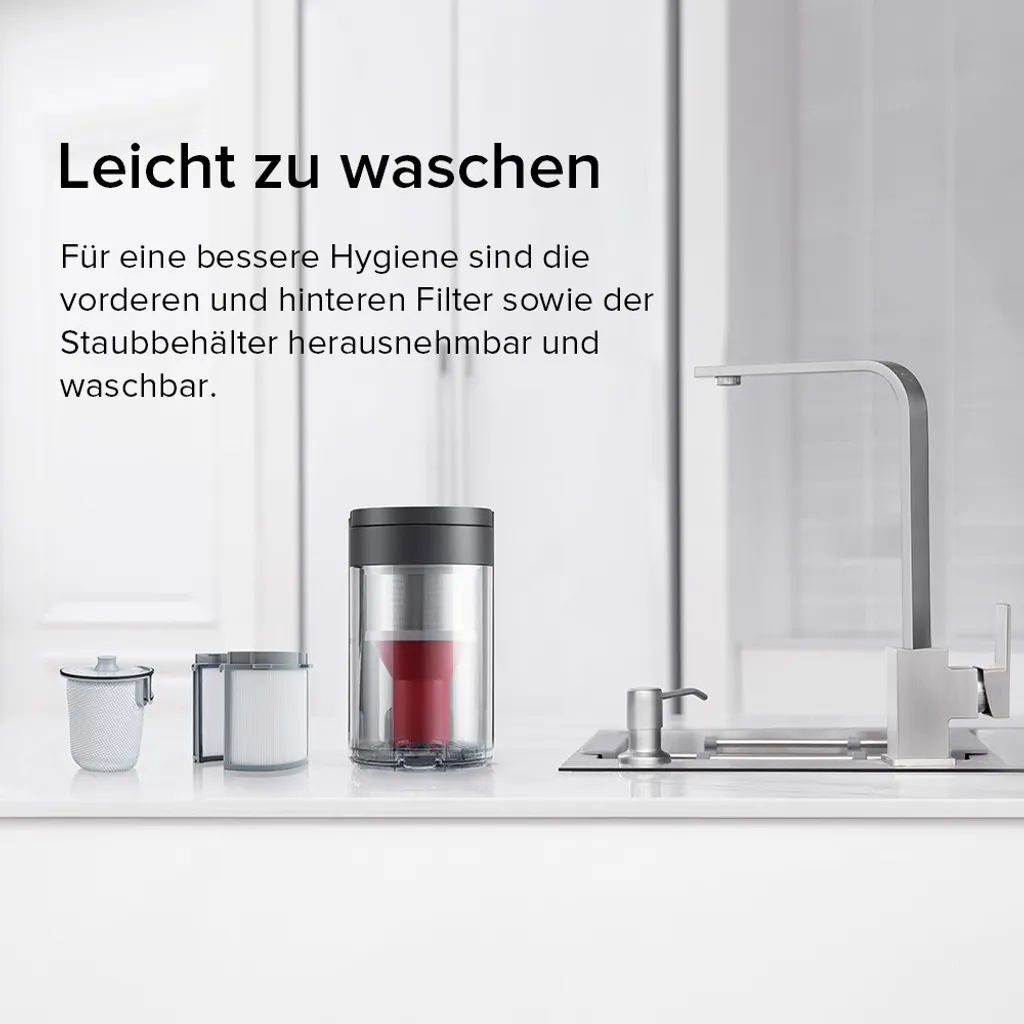 Leicht waschbar – Die vorderen und hinteren Filter sowie der Mülleimer sind abnehmbar und waschbar für eine bessere Hygiene.