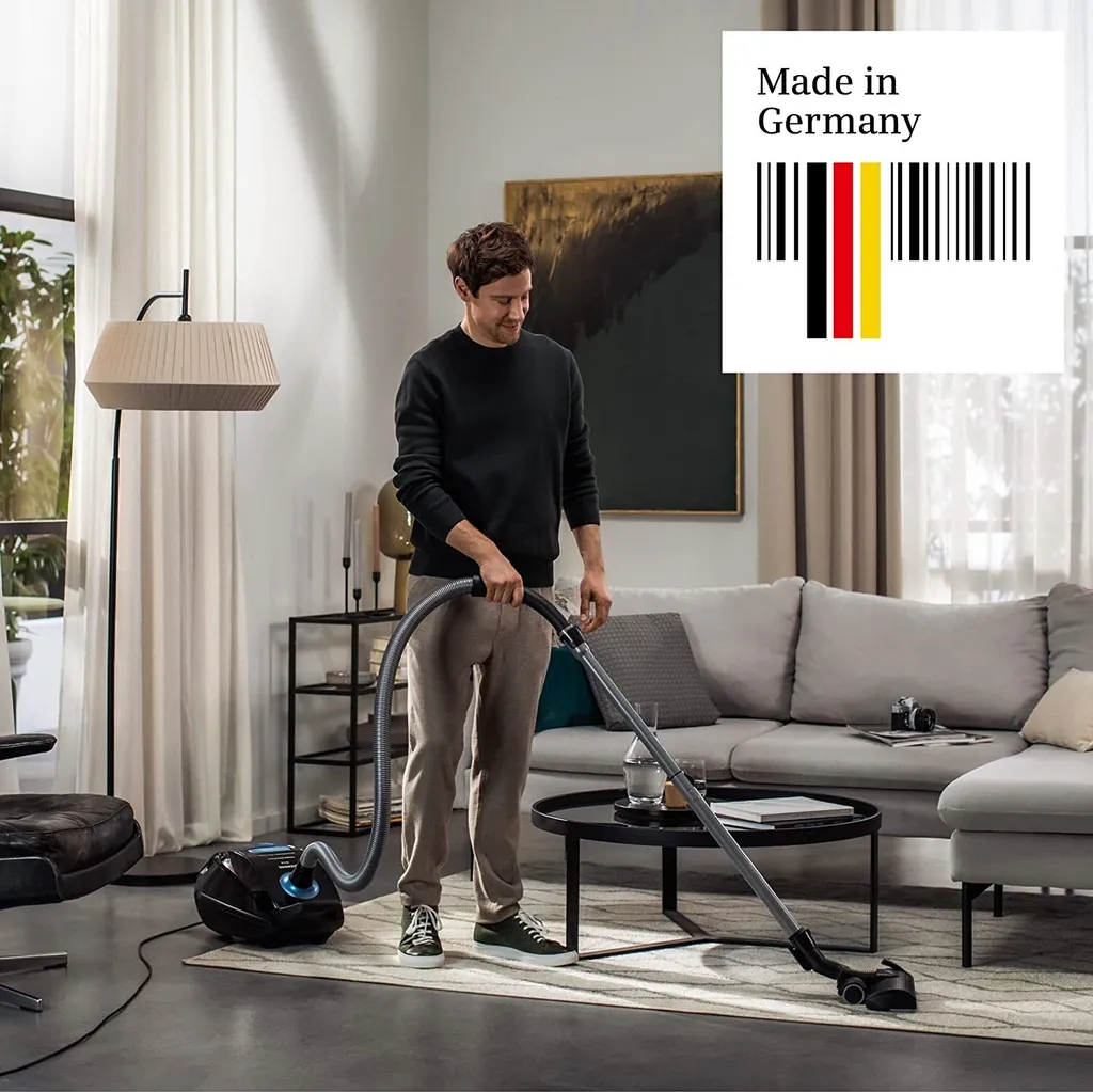 Besonders leise umschaltbare Rollendüse SilentClean Premium mit Metallsohle,und Clip-Verbindung für extra gründliche Reinigungsleistung, 2-teiliges Zubehör, integriert: Fugendüse, Polsterdüse, Teleskoprohr mit Clip-Verschluß,Ergo-Handgriff, Filtervolumen: 4.5 l,Aktionsradius: 13 m, softBumper Protection: seitlicher Möbel- und Wandschutz, 4 Soft-Lenkrollen für maximale Wendigkeit und Schonung harter,Fußbodenbeläge, Elektronische Saugkraftregulierung mit Drehregler, Elektrische Filterwechselanzeige, Park- und Abstellhilfe, Automatischer Kabeleinzug, 4 Lenkrollen, Gewicht: 5.8 kg (ohne Saugzubehör), Farbe: schwarz/blau