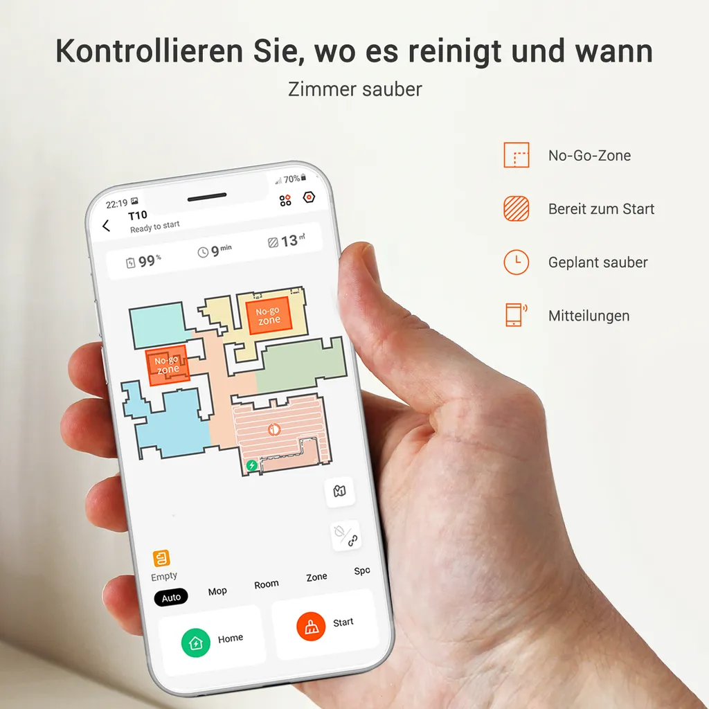 Virtuelle Grenzen:Sie können über die APP virtuelle Grenzen (kein Magnetstreifen erforderlich) einrichten,damit Saugerroboter mit Wischfunktion nur in dem gewünschten Bereich funktioniert